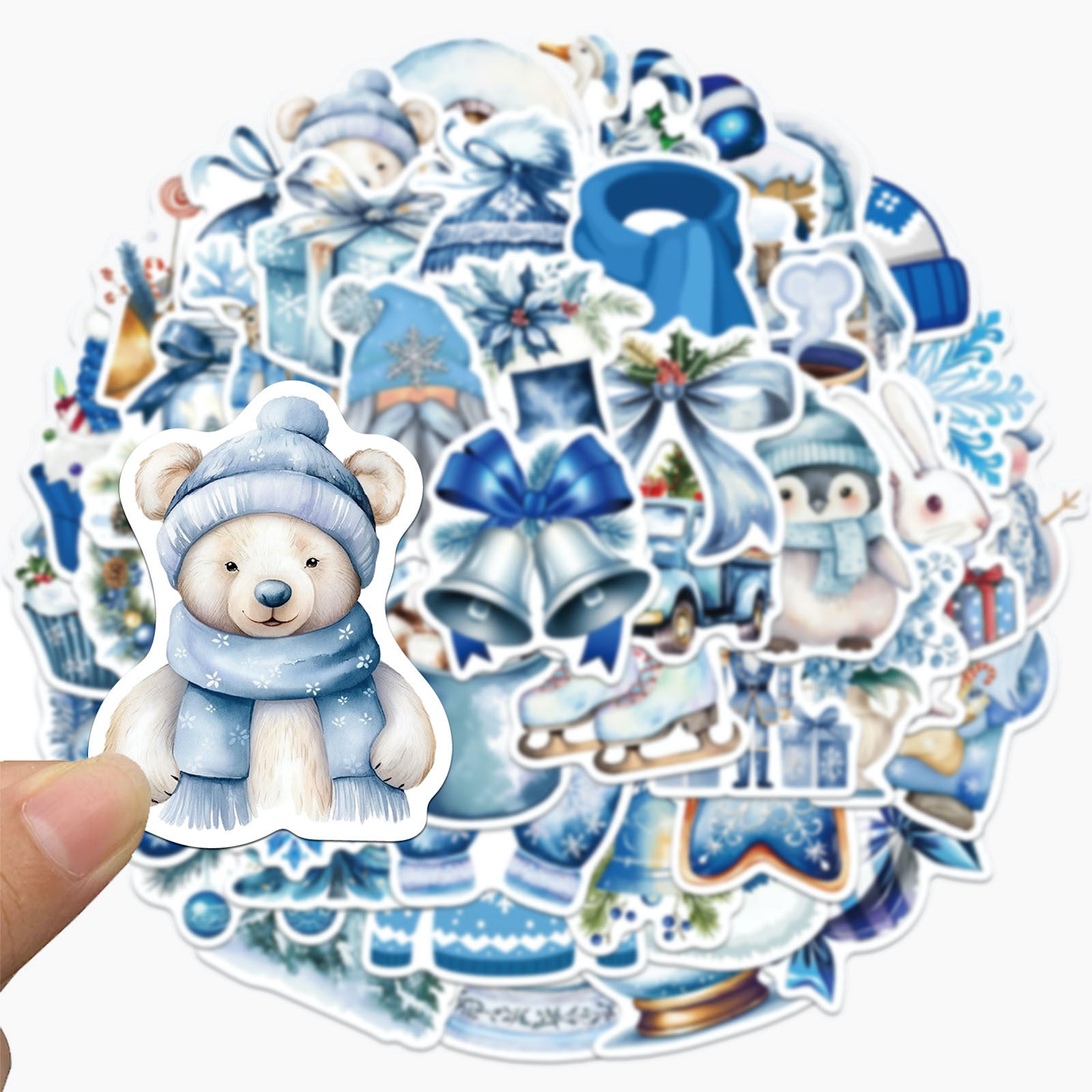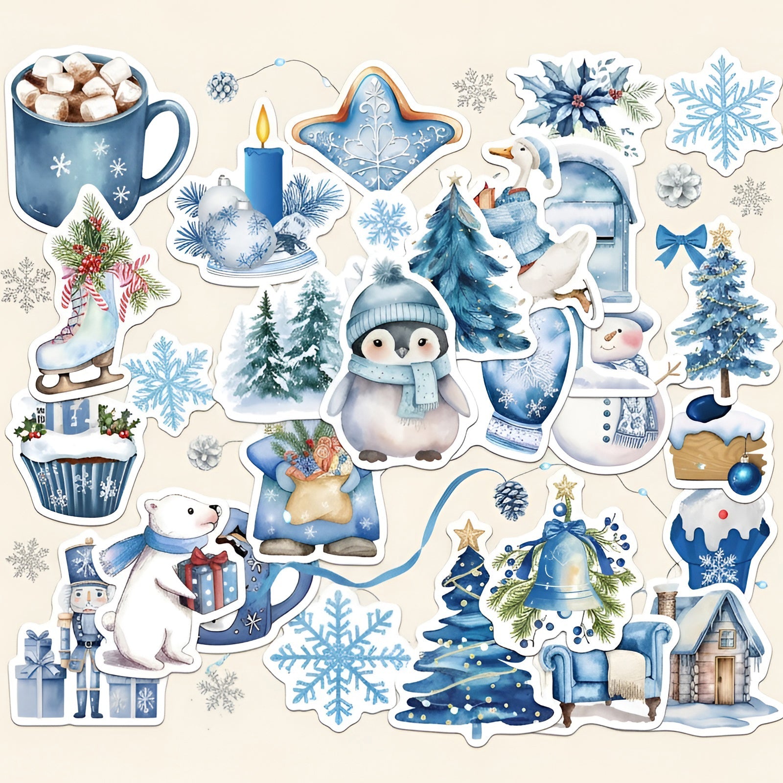 Bring the charm of a snowy day to your stationery collection with the Blue Winter Wonderland Stickers Set! This 50-piece set captures the magic of winter in dreamy watercolor hues — from cuddly polar bears and penguins in scarves to snowflakes, trees, and cozy mugs of cocoa. Each glossy PVC sticker is waterproof, durable, and perfect for adding a frosty sparkle to your laptop, tumbler, journal, or gift wrap. ✨