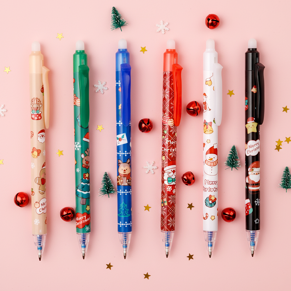 Add some merry magic to your notes and letters with the Jolly Friends Erasable Gel Pens! Each pen features a smooth 0.5 mm blue ink tip and a soft rubber eraser top that lets you fix mistakes instantly — just rub gently and rewrite. The glossy barrel comes in six adorable Christmas-themed designs, showcasing cheerful Santa Claus, reindeer, snowmen, gingerbread cookies, Christmas trees, and festive ornaments. Each pen clip matches its design in vibrant seasonal colors like red, green, blue, and cream.