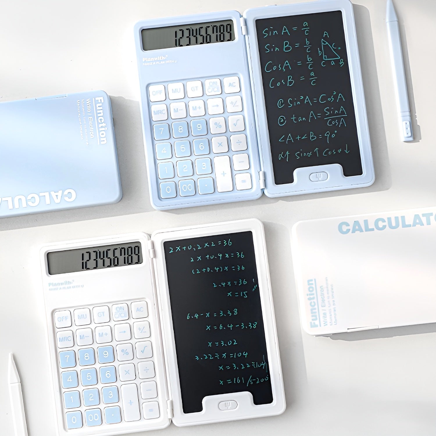 Solve and scribble side-by-side with the Math Mate! This smart foldable calculator opens up to reveal a full-function calculator on one side and a digital writing pad on the other — perfect for jotting down equations, steps, or quick notes. Tap the erase button to clear your pad in seconds, then fold it up and go. It’s lightweight, compact, and a brilliant study or office companion! ✏️📊
