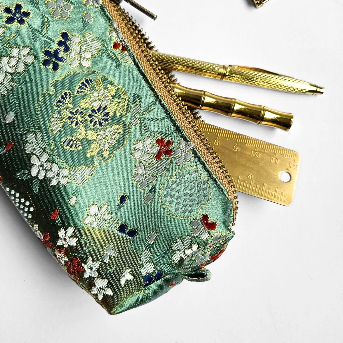 Carry your favorite pens with a touch of timeless elegance in the Memories of Flowers Pencil Case. This luxurious pouch features a rich, Japanese classic floral pattern adorned with intricate embroidery and subtle gold foil details, giving it a warm, vintage feel. The exterior is crafted from a durable, textured fabric, while the interior is lined with soft, protective velvet, ensuring your fine pens and supplies are cradled safely. Choose between the romantic Light Pink or the sophisticated Mint Blue to carry your items with unparalleled grace.