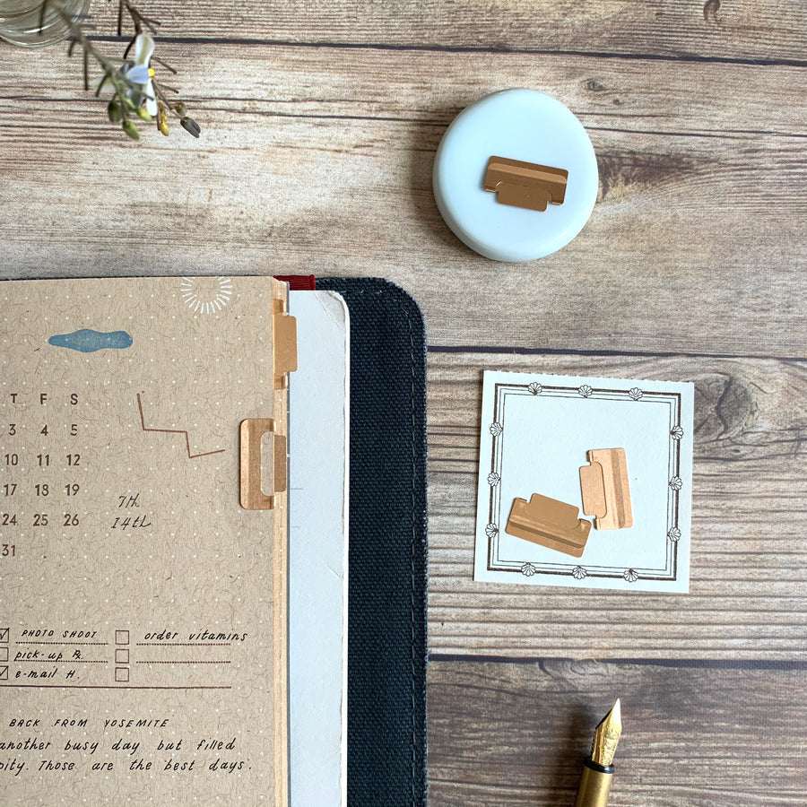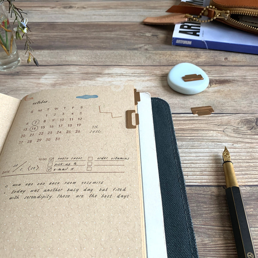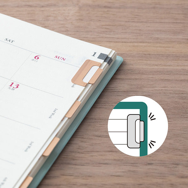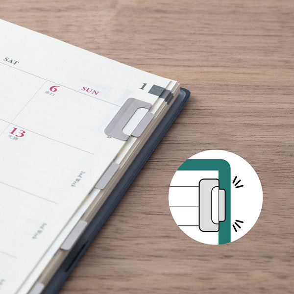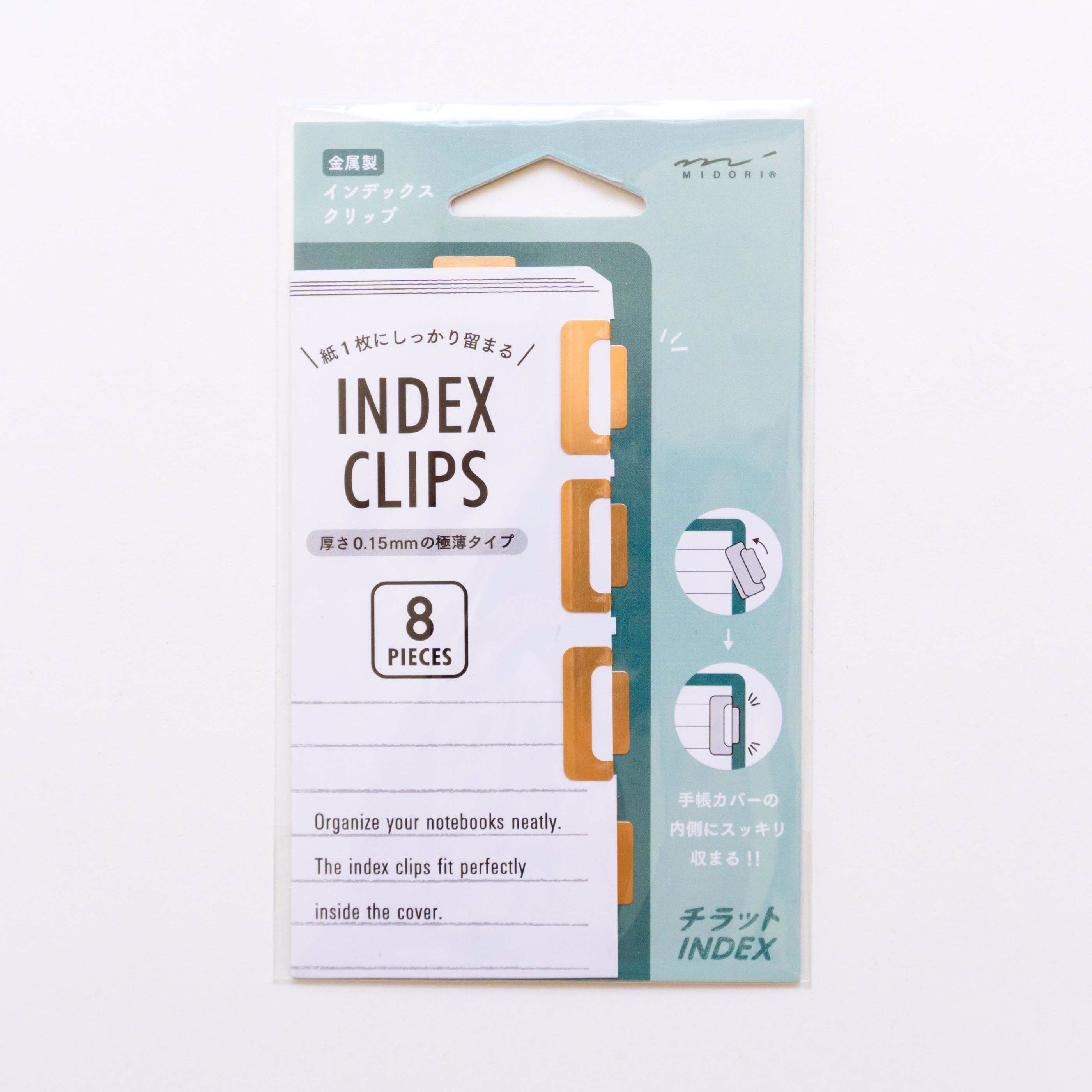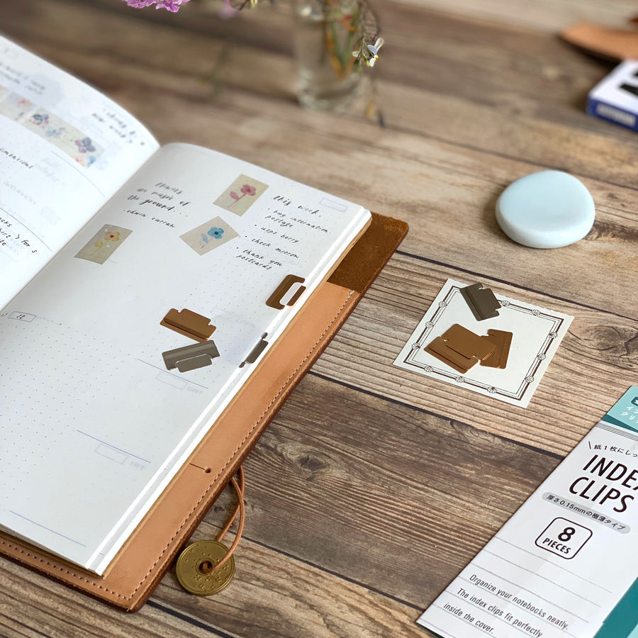 Tidy up your notes in the most elegant way! These ultra-thin index clips from Midori double as bookmarks and page markers, crafted with a sleek 0.15 mm profile that fits perfectly inside notebook covers without bulk. Whether you're labeling sections or saving your spot, they clip on horizontally or vertically and stick out just enough to grab with ease—without bending your pages.