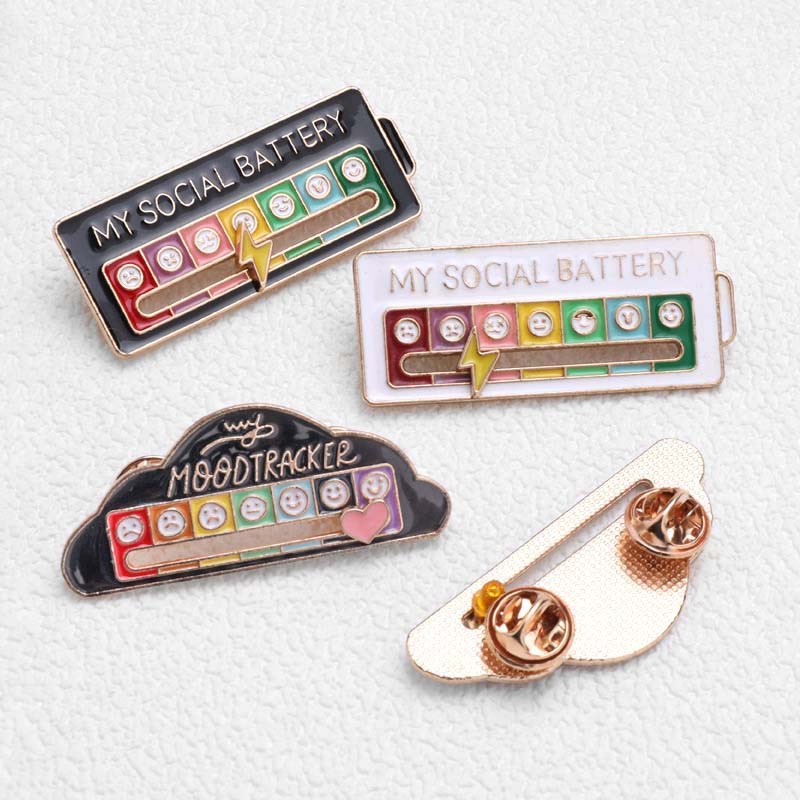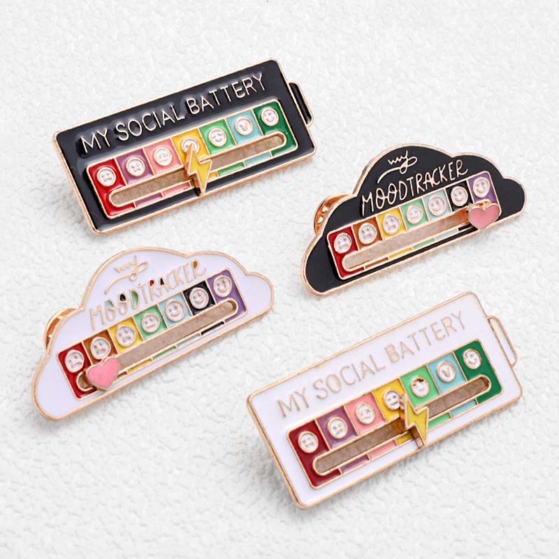 Let the world know how you're feeling with the Mood Tracker Enamel Pin! This interactive pin is a fun and stylish way to communicate your mood at a glance. Featuring a unique sliding mechanism, you can easily adjust the meter to reflect your current energy level. Choose from two playful designs: