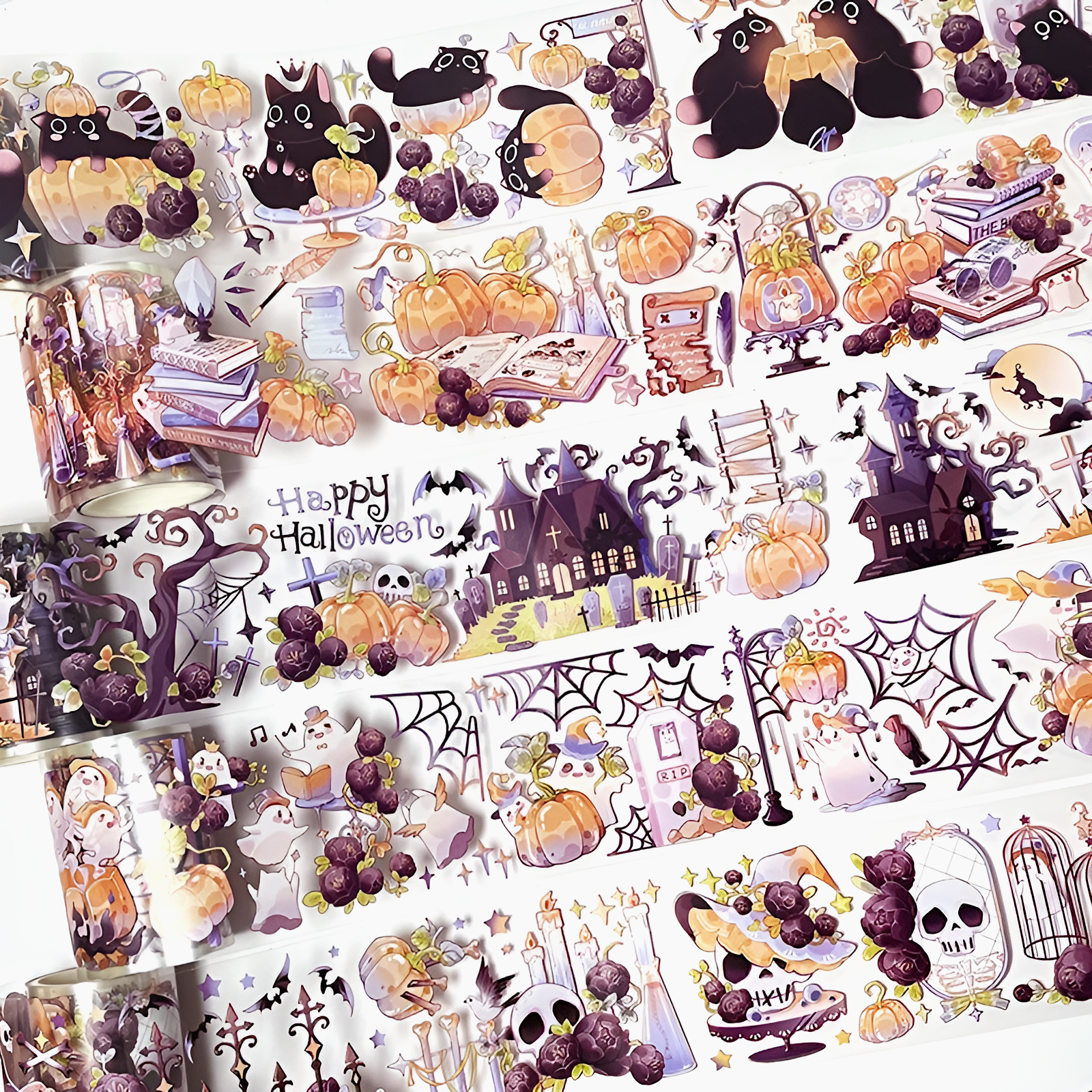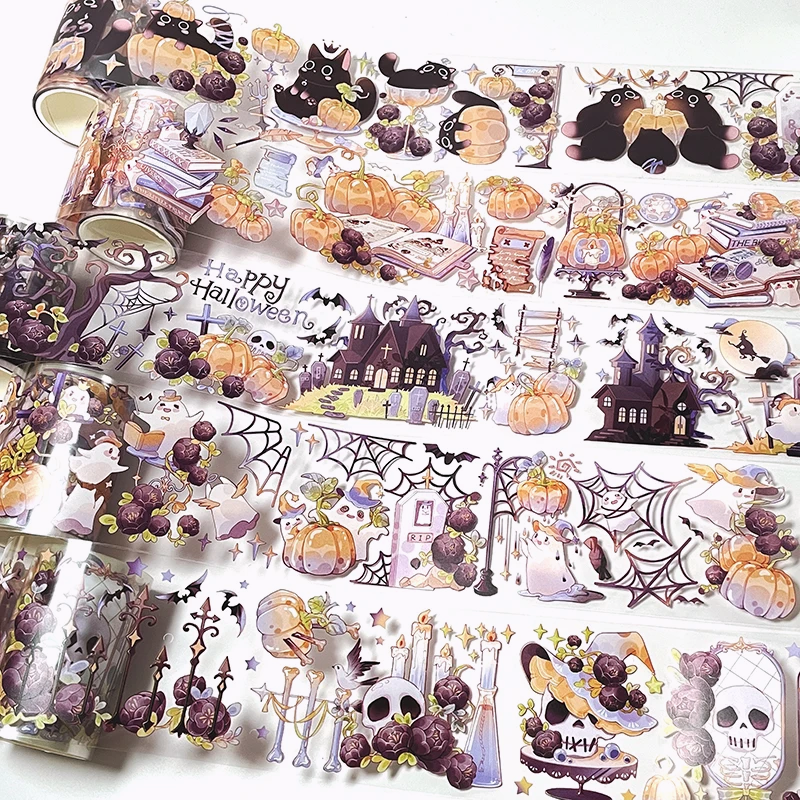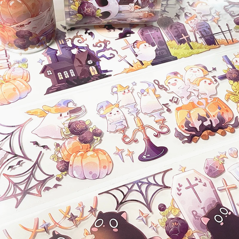 Cast a little Halloween magic on your crafts with this enchanting PET masking tape! Featuring chibi-style black cats, playful ghosts, pumpkins, spider webs, and gothic houses, this glossy and waterproof tape adds a whimsical touch to journals, gift wrap, and DIY projects. At 6 cm wide and 2 m long, you can use the design as a bold border or cut it into smaller pieces for stickers.
