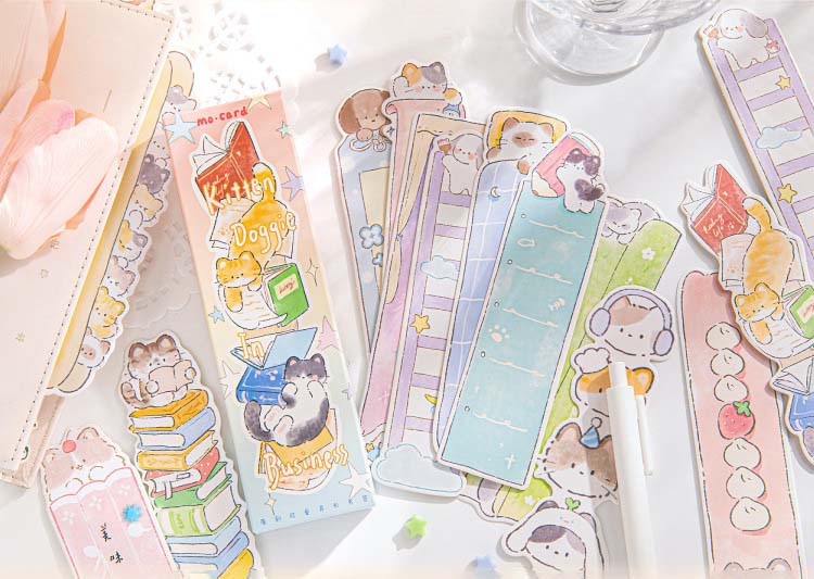 Mark your pages in the cutest way possible with the Paws & Pages Bookmark Set! Featuring 30 charming designs of cats and dogs in playful, cozy, and silly poses, these bookmarks are as functional as they are adorable. Whether it's a cat snuggled in bed, kittens tucked inside a loaf of bread, or a pup climbing the stairs, these designs will bring a smile to every book lover's face!