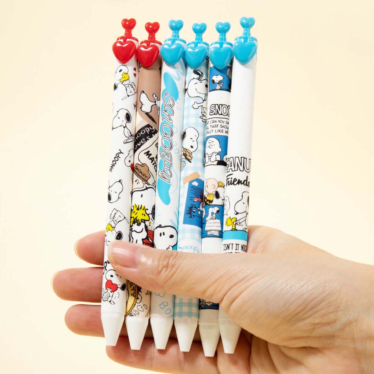 Add a touch of Snoopy charm to your writing with the Peanuts Snoopy Heartbeat Pen! This adorable retractable pen features 6 unique designs, from playful patterns to classic Peanuts comic strips, so there’s a perfect match for everyone! With a sleek barrel, a smooth 0.5mm ST tip, and a decorative heart topper, this pen is as stylish as it is functional.Plus, the heart-shaped retractable button adds an extra dose of love to every click!