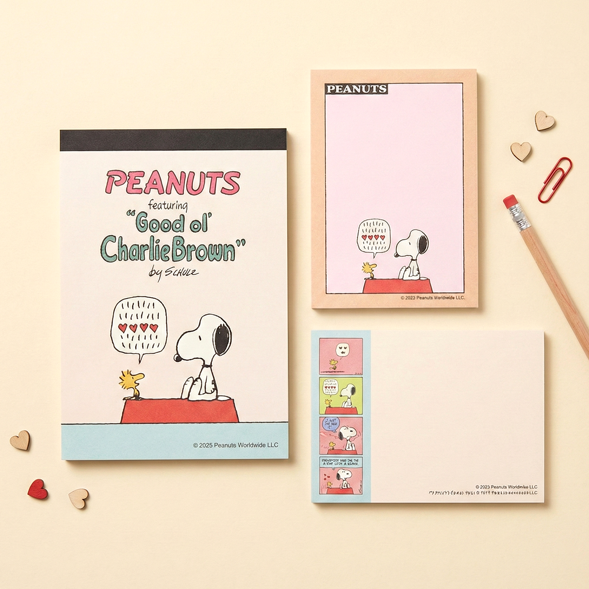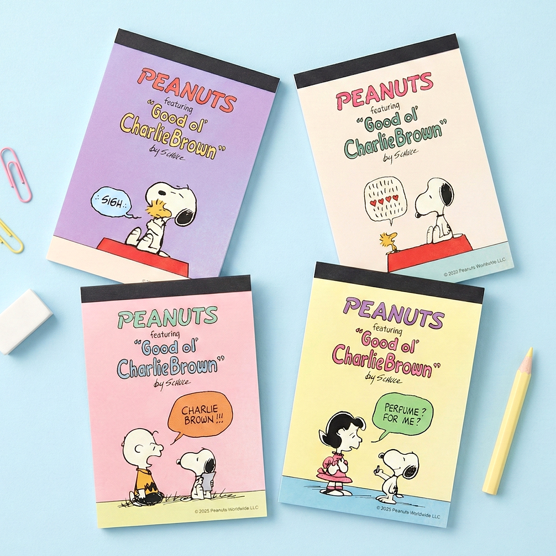 Keep your thoughts tidy and your spirits bright with the Peanuts Snoopy Memo Pads! These mini, portable notepads are perfect for quick notes, to-do lists, grocery reminders, and small messages. Each pad features a soft pastel cover (choose from 4 vibrant colors!) and contains 80 sheets, split into two distinct page designs—a vertical layout and a horizontal layout. Adorned with humorous comic vignettes of Snoopy, Charlie Brown, and friends, these pads make writing down your quick thoughts an absolute joy!