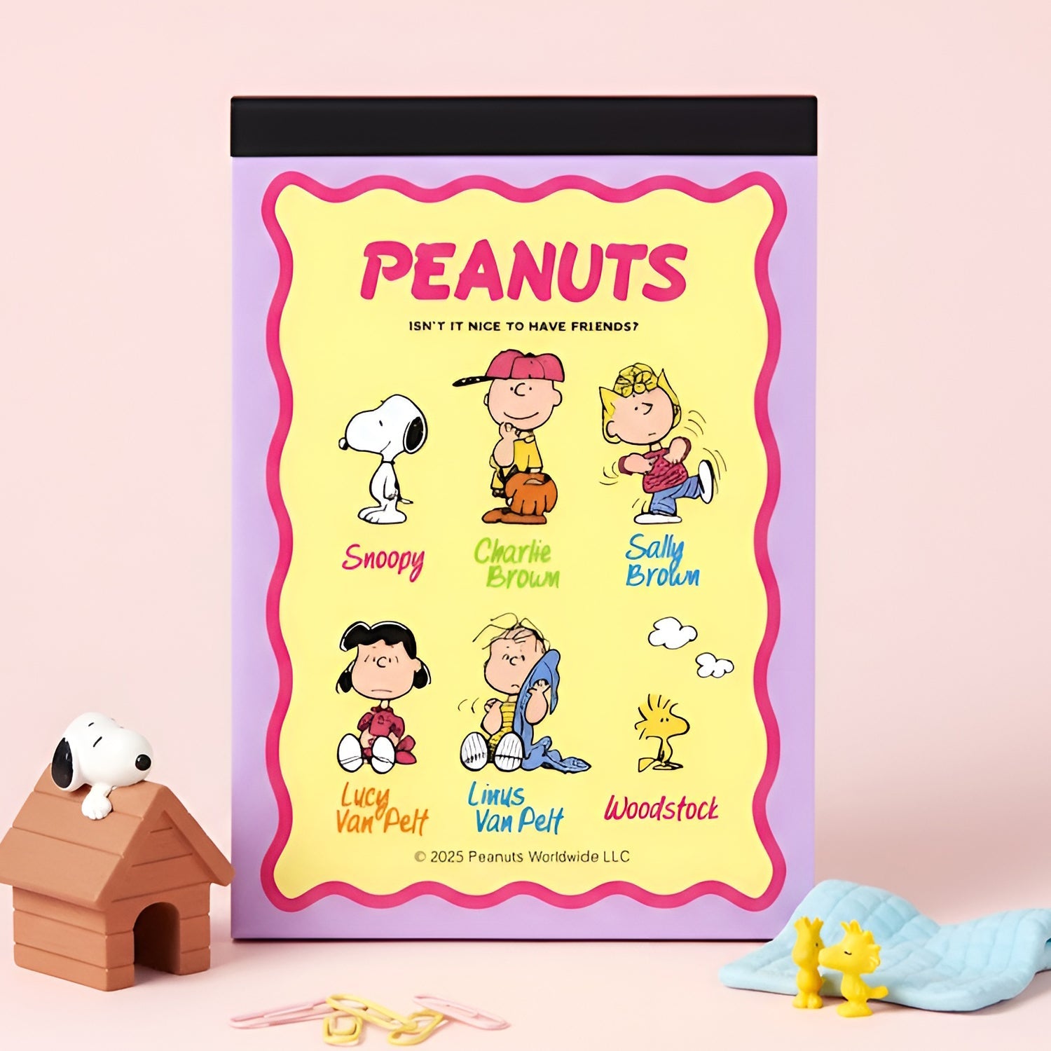 Celebrate friendship with the colorful Peanuts Snoopy & Friends Petit Collection Memo Pad! The striking cover features the six most beloved characters—Snoopy, Charlie Brown, Sally, Lucy, Linus, and Woodstock—all gathered around a cheerful, wavy border. This mini-notepad includes two distinct page designs: a vertical, character-labeled page perfect for quick reminders, and a unique horizontal page featuring a decorative, wide-grid layout ideal for lists and planning. Protected by a clear PET cover, this pad is cute, colorful, and ready to travel everywhere you go!