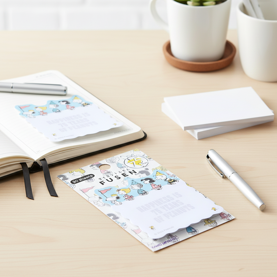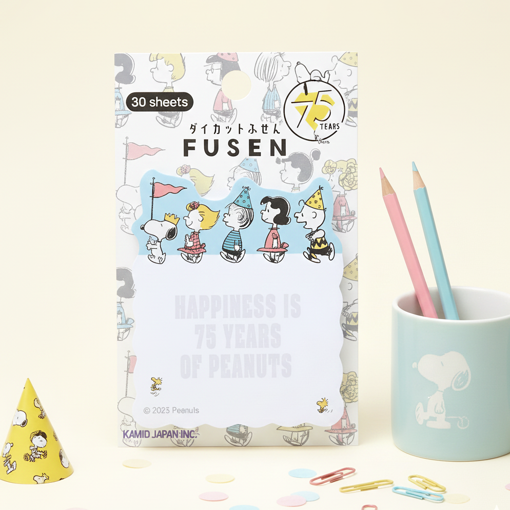 Join the celebration with the Limited 75th Anniversary Edition Snoopy Sticky Notes - Happy March! This highly collectible set of 30 die-cut sticky notes (Fusen) features Snoopy, Woodstock, and the entire Peanuts gang marching happily across the top, all donning party hats. The unique, wavy-edged shape frames the celebratory message: Happiness is 75 Years of Peanuts! These high-quality, made-in-Japan sticky notes are perfect for planners, journals, books, or sending a special, limited-edition reminder!