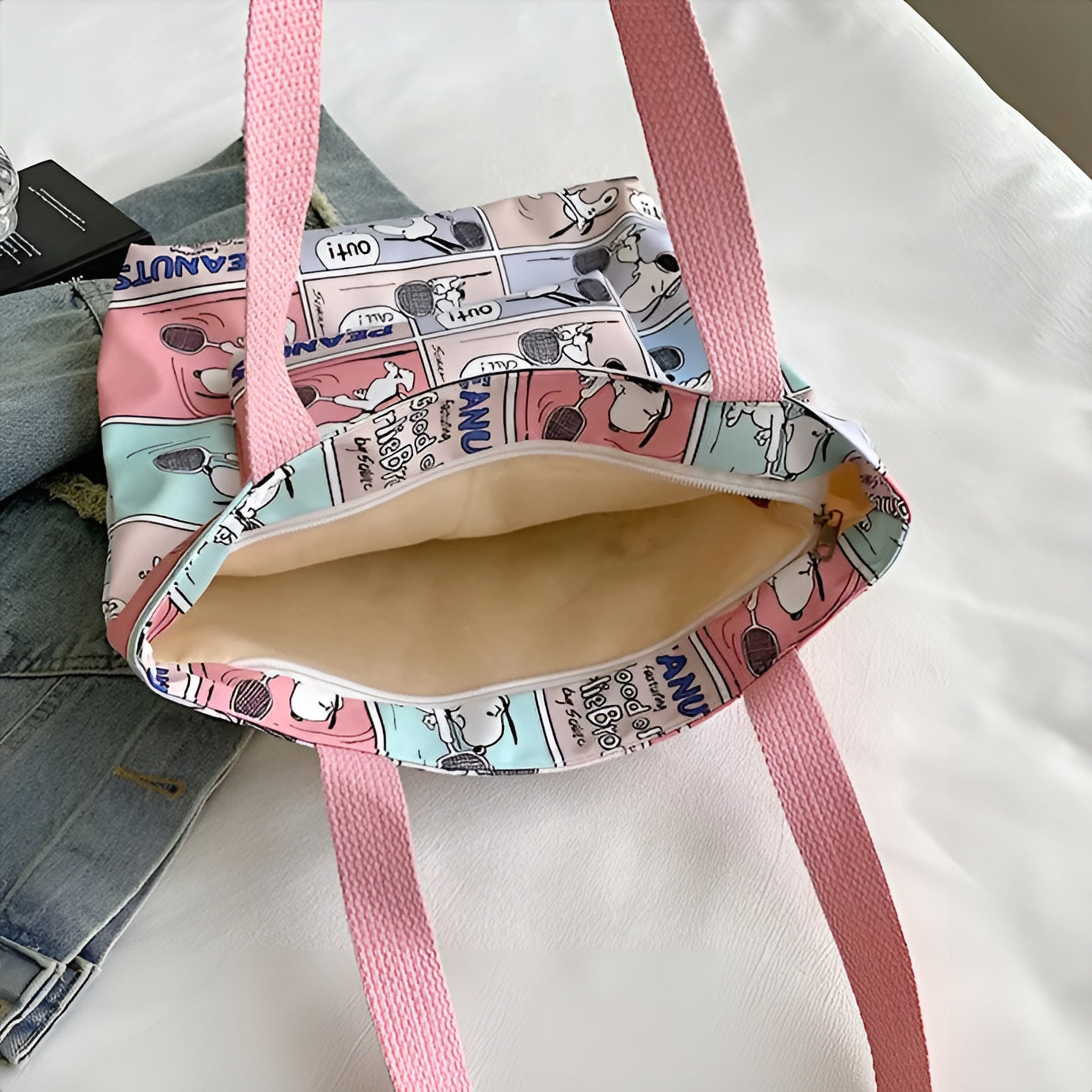 Ready, set, out! Snoopy’s bringing sporty charm and pastel fun to your everyday adventures with this playful Peanuts tote! Featuring a colorful comic-strip design of our favorite beagle mid-tennis match, this roomy shoulder bag is both cute and practical—perfect for school, journaling outings, or grocery day.