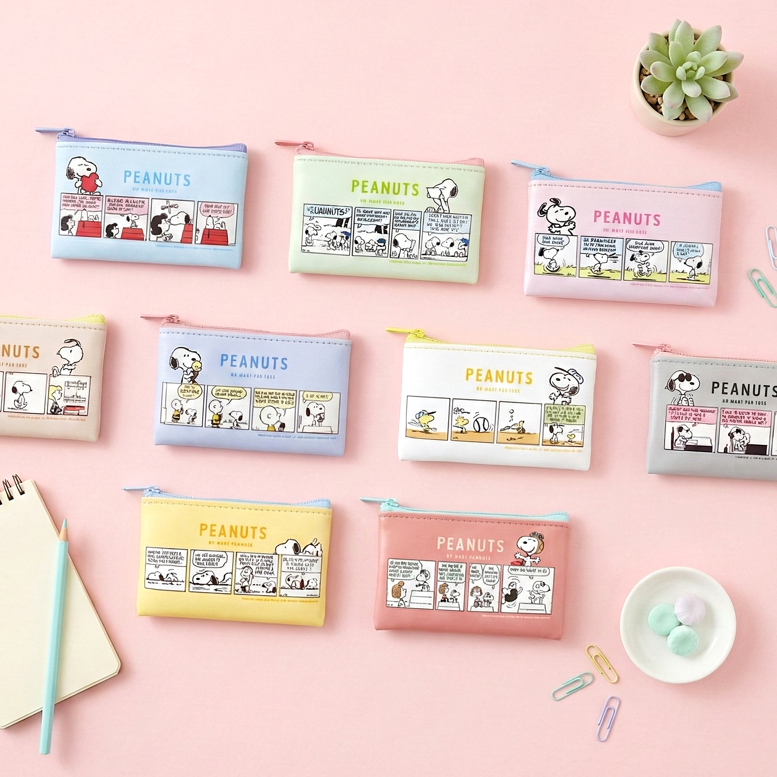 Add a little excitement to your travels with this adorable blind-box Peanuts pouch! Each pouch is made of smooth synthetic leather and decorated with a classic Snoopy comic strip on the front plus a sweet illustration on the back. With 10 possible designs (including 1 mystery secret!), every unboxing is a delightful surprise.