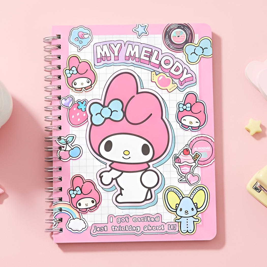 Take sweet notes with My Melody in this retro Y2K-inspired notebook! The pastel pink B6 double-ring design makes it easy to flip through pages, while the grid sheets are softly tinted with My Melody illustrations at the corners. The cover sparkles with strawberries, cherries, rainbows, and sweets for a nostalgic touch. Perfect for journaling, class notes, or doodling your dreams.