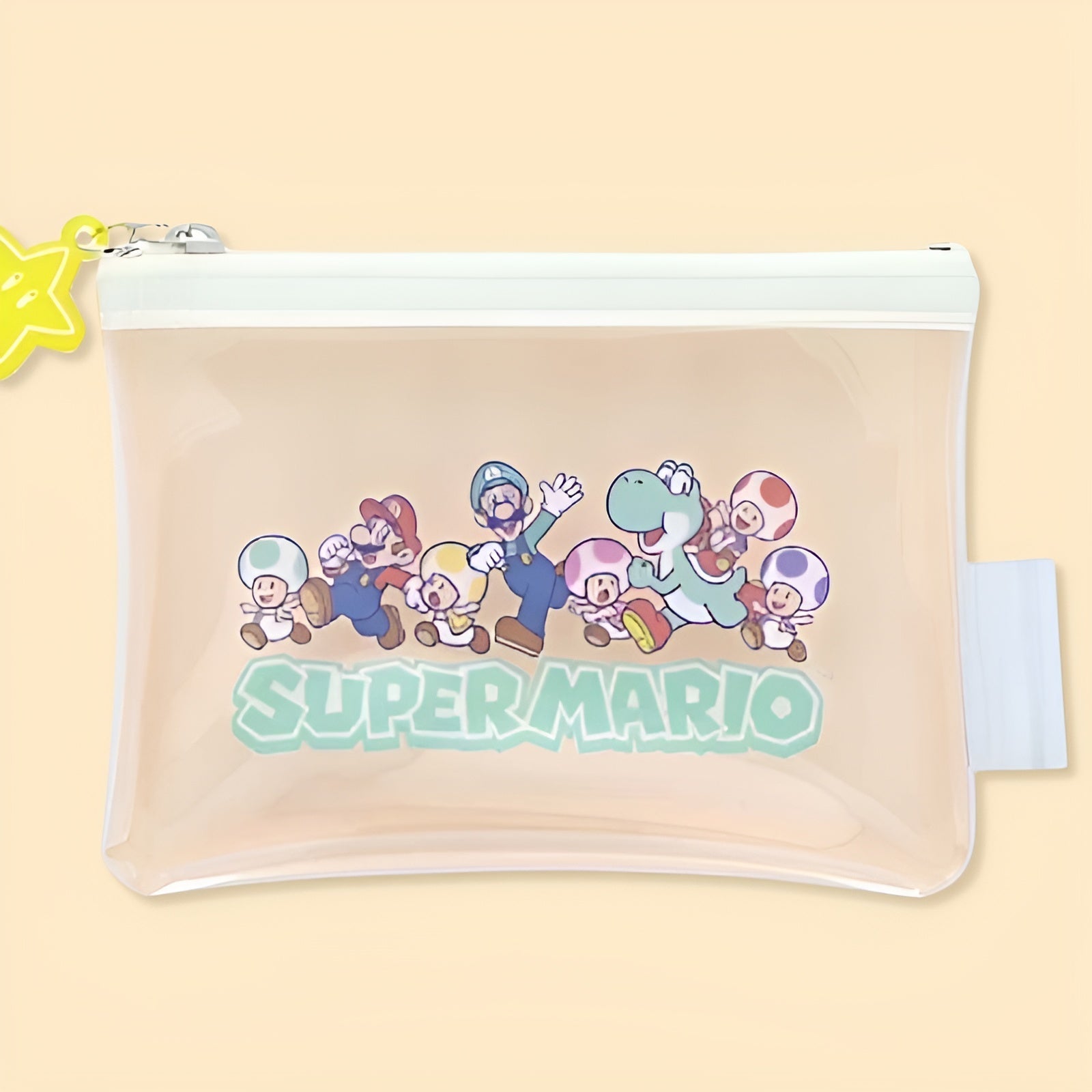 Keep your stationery or on-the-go essentials safe in pixel-perfect style with this adorable Super Mario pouch! Featuring the whole gang—Mario, Luigi, Yoshi, and the Toads—on a translucent peach PVC background, this compact zip pouch is both cute and practical. The clear front lets you see exactly what’s inside, while the cheerful yellow star zipper pull adds an extra power-up to your day! ⭐💼