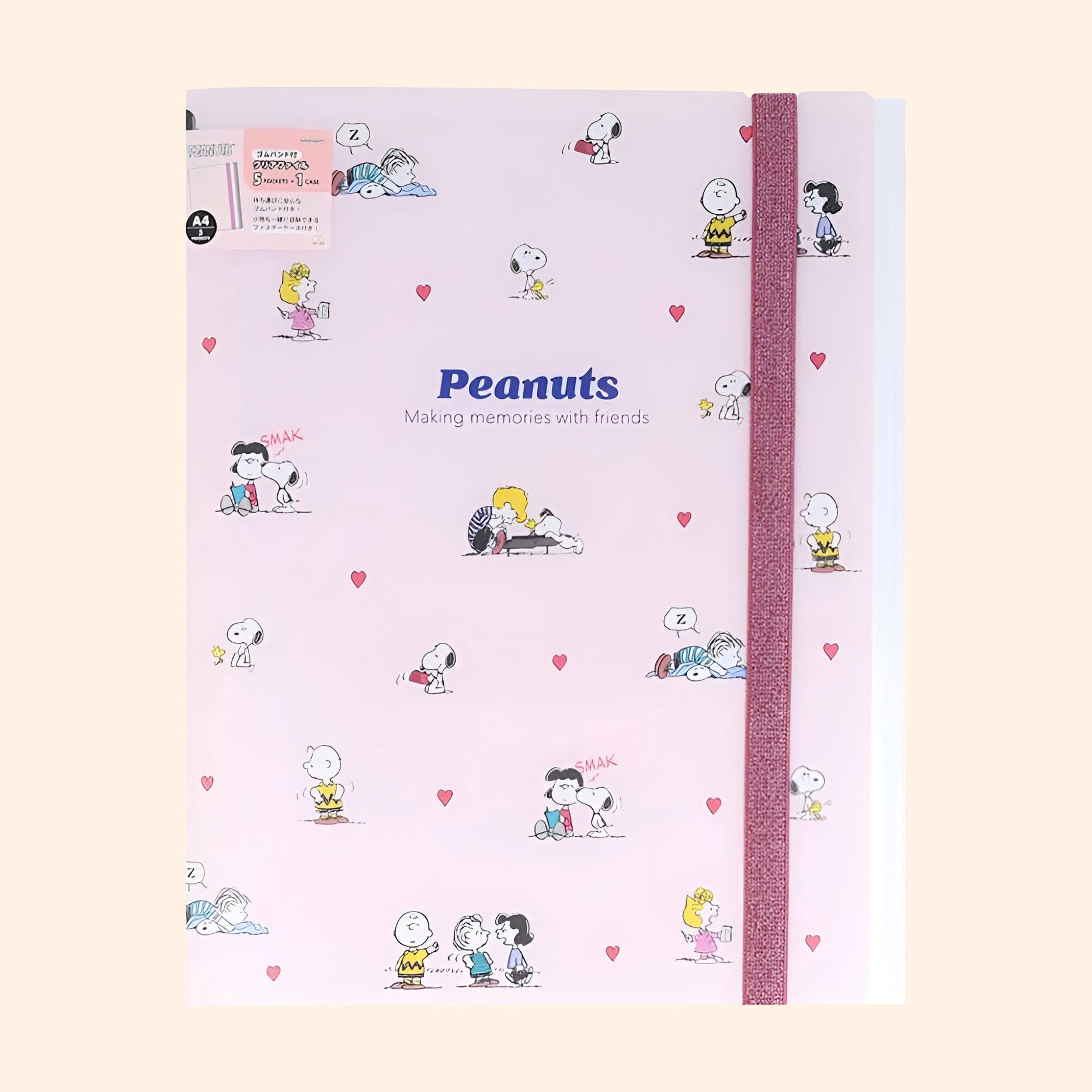 Organize your papers with a touch of sweetness and Peanuts charm! This light pink A4 clear book by Sun-Star Japan is covered in adorable Snoopy and friends scenes that celebrate friendship and fun. Featuring 5 double-sided clear pockets, a bonus zipper pocket, and a glittery pink elastic band, this folder keeps your documents tidy and your heart happy. 🌸📄