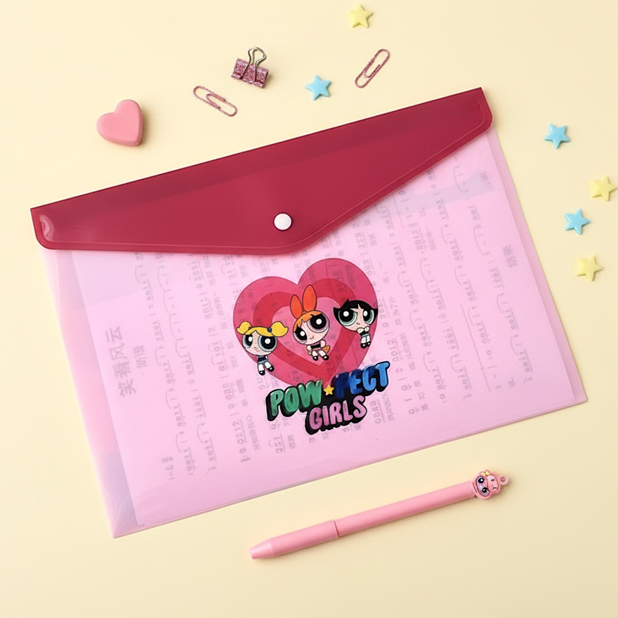 Organize your papers with a burst of girl power! This Powerpuff Girls A4 Folder features Blossom, Bubbles, and Buttercup in vibrant comic-style poses on a pink backdrop with floating hearts, stars, and colorful action words like “Whnk!” and “Biff!”. Made of durable, waterproof PVC with a glossy finish, it keeps your documents safe and stylish. The envelope-style closure with a snap button ensures everything stays neatly inside — perfect for school, work, or your stationery collection. 💗⚡