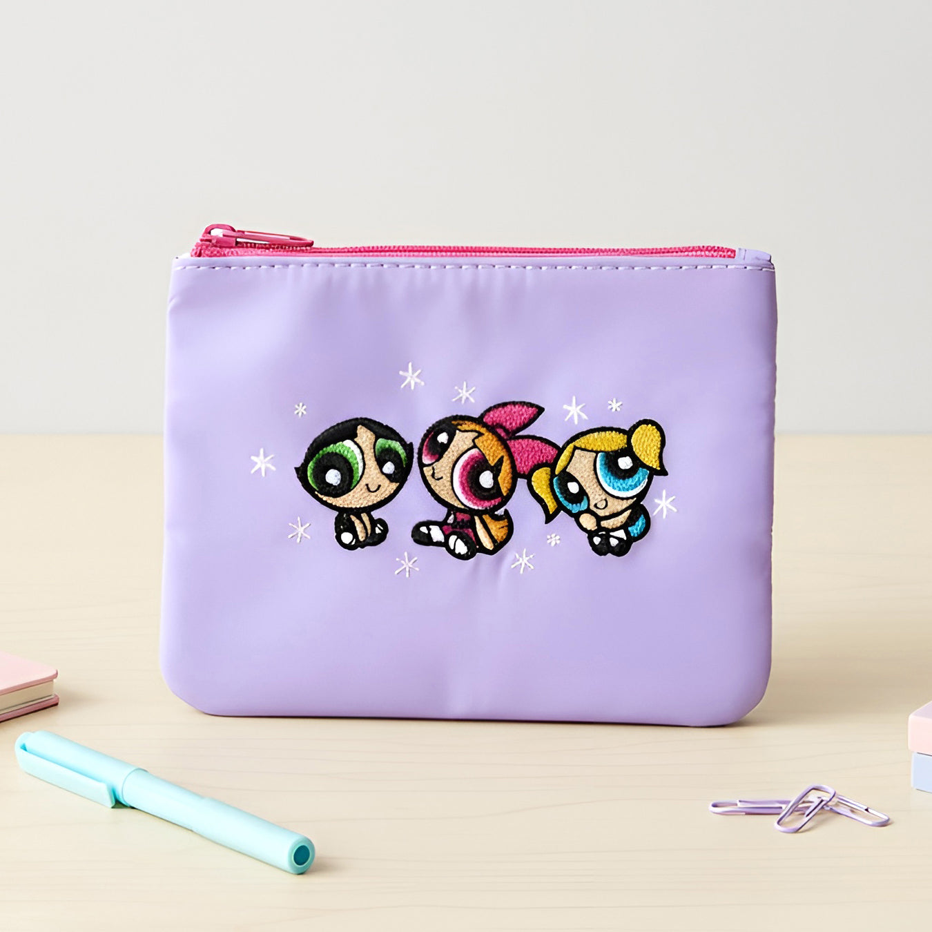 This adorable lilac pouch featuring Blossom, Bubbles, and Buttercup is here to save your clutter! Whether it’s for makeup, period products, or tech bits, this compact case packs plenty of charm into a neat and portable design.