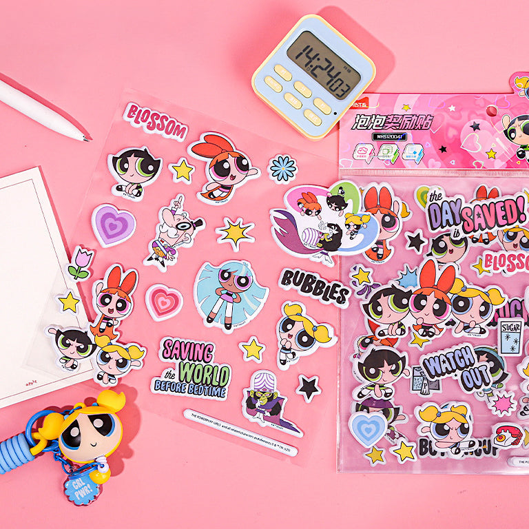 These oversized Powerpuff stickers pack a punch! Each 19.5 × 19.5 cm sheet is loaded with vibrant, 3D-effect designs that pop with personality. Choose from 2 colorful styles featuring Blossom, Bubbles, Buttercup, and more in full hero mode!