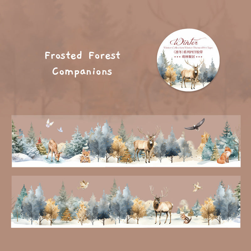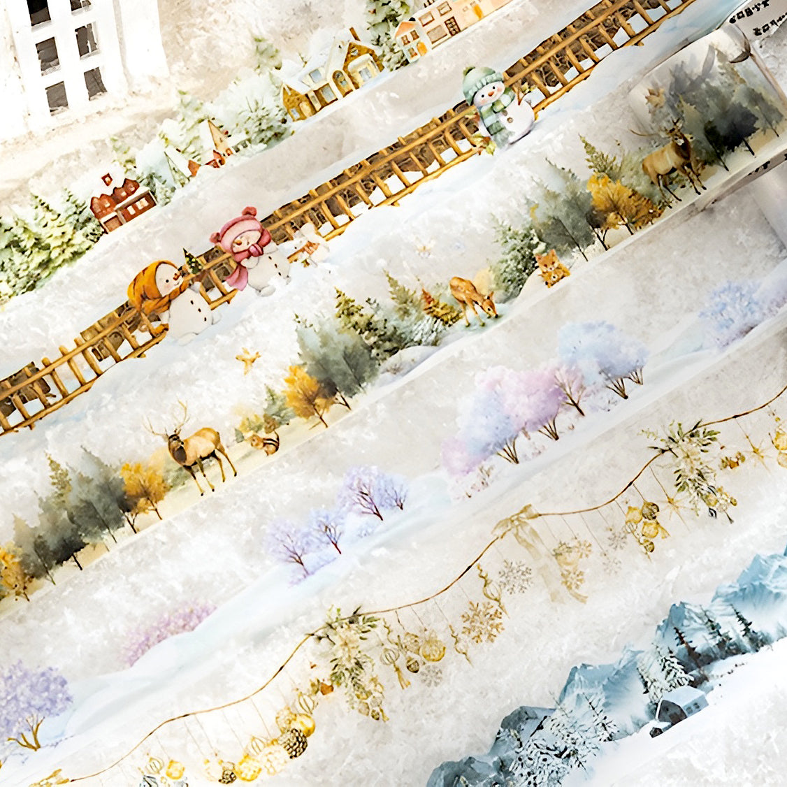 Bring a touch of cozy magic to your journals with the Winter Storyland Masking Tapes — a breathtaking series of PET transparent tapes that capture the warmth and wonder of a snow-covered world. Each roll features a seamless winter scene that blends beautifully on any surface: from glowing cottage villages nestled in pine forests to playful snowmen along wooden fences and peaceful deer wandering among frosted trees. 💙